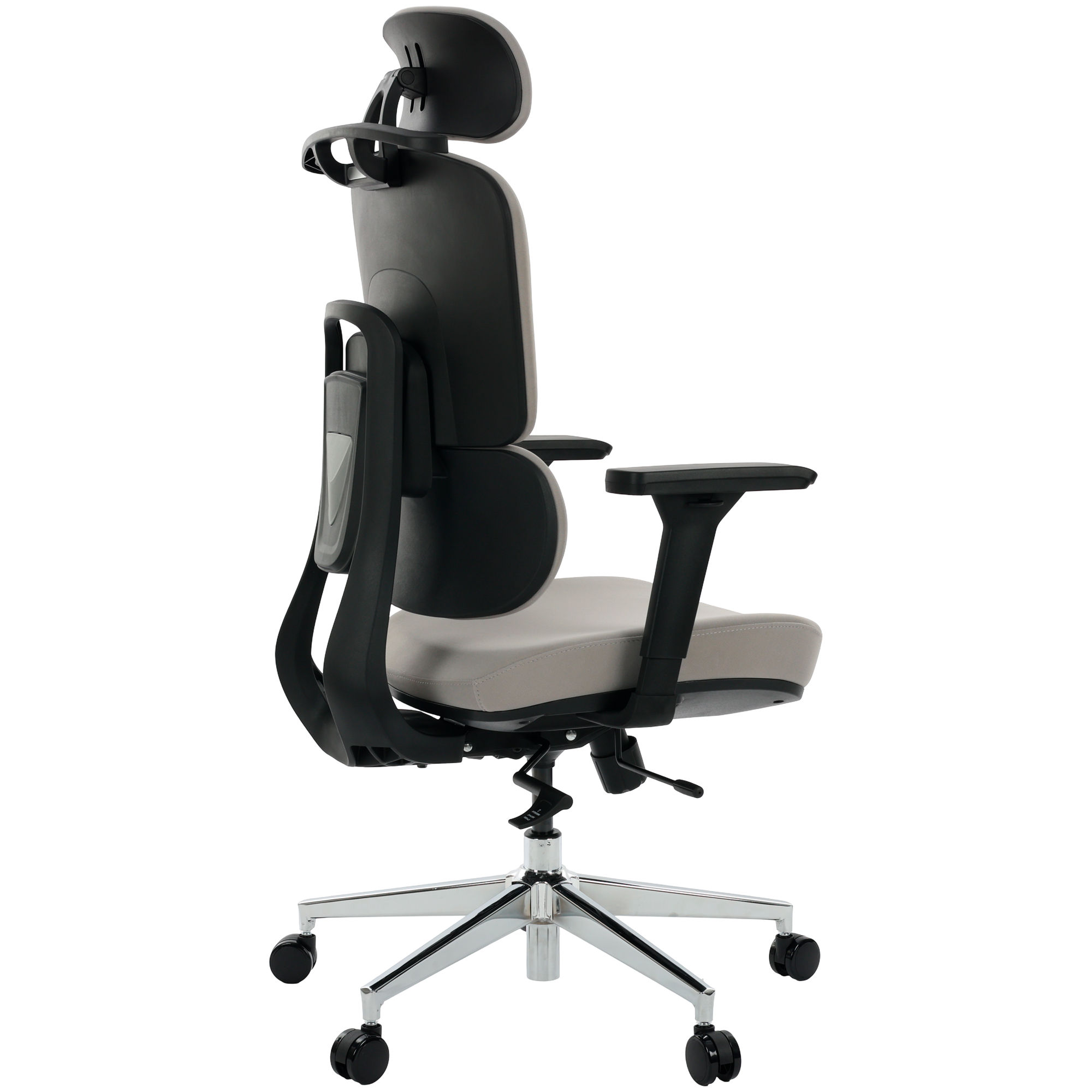 Com acabamento em tecido cinza de alta qualidade e estrutura robusta em metal cromado, ela entrega conforto prolongado, postura correta e um visual contemporâneo que valoriza qualquer ambiente profissional.