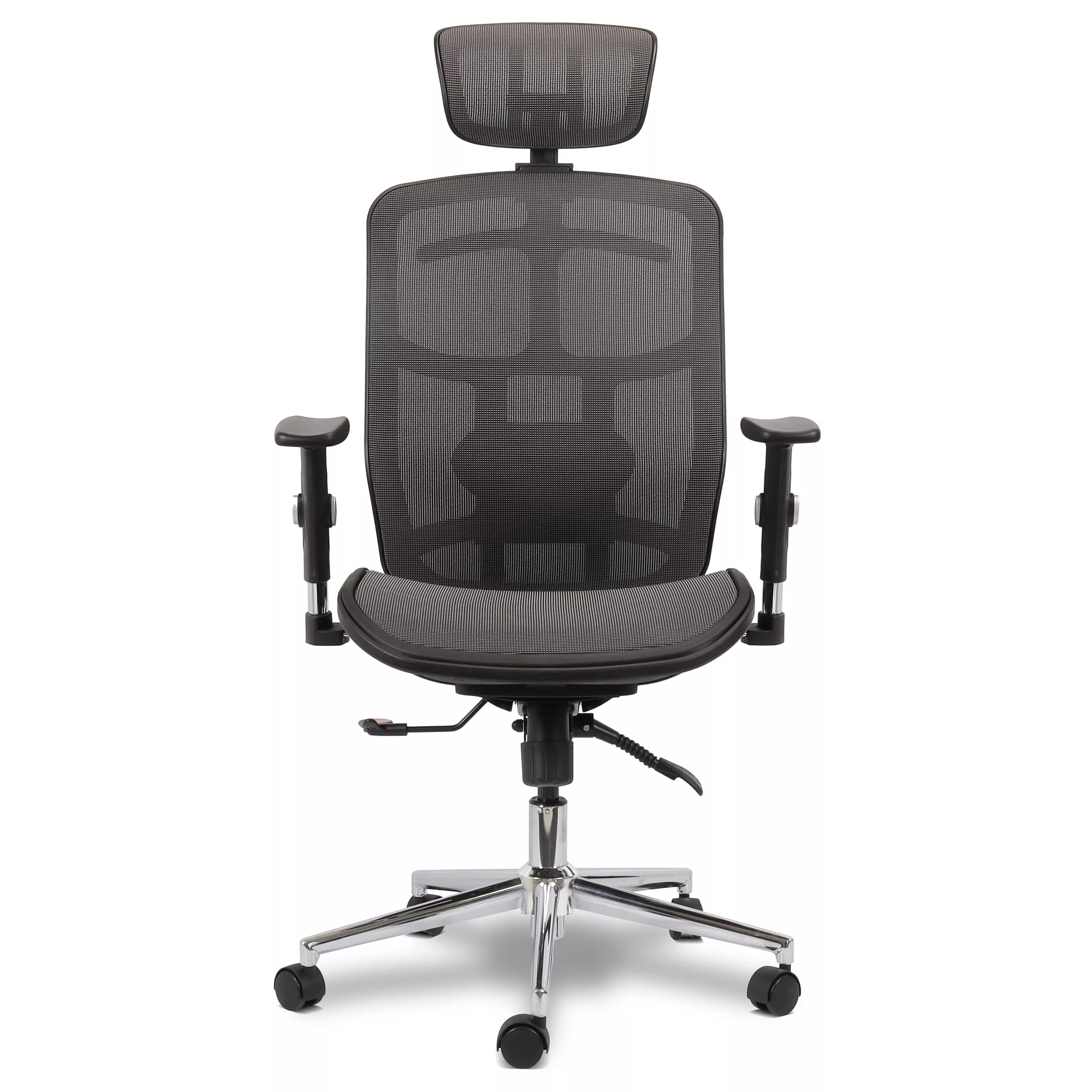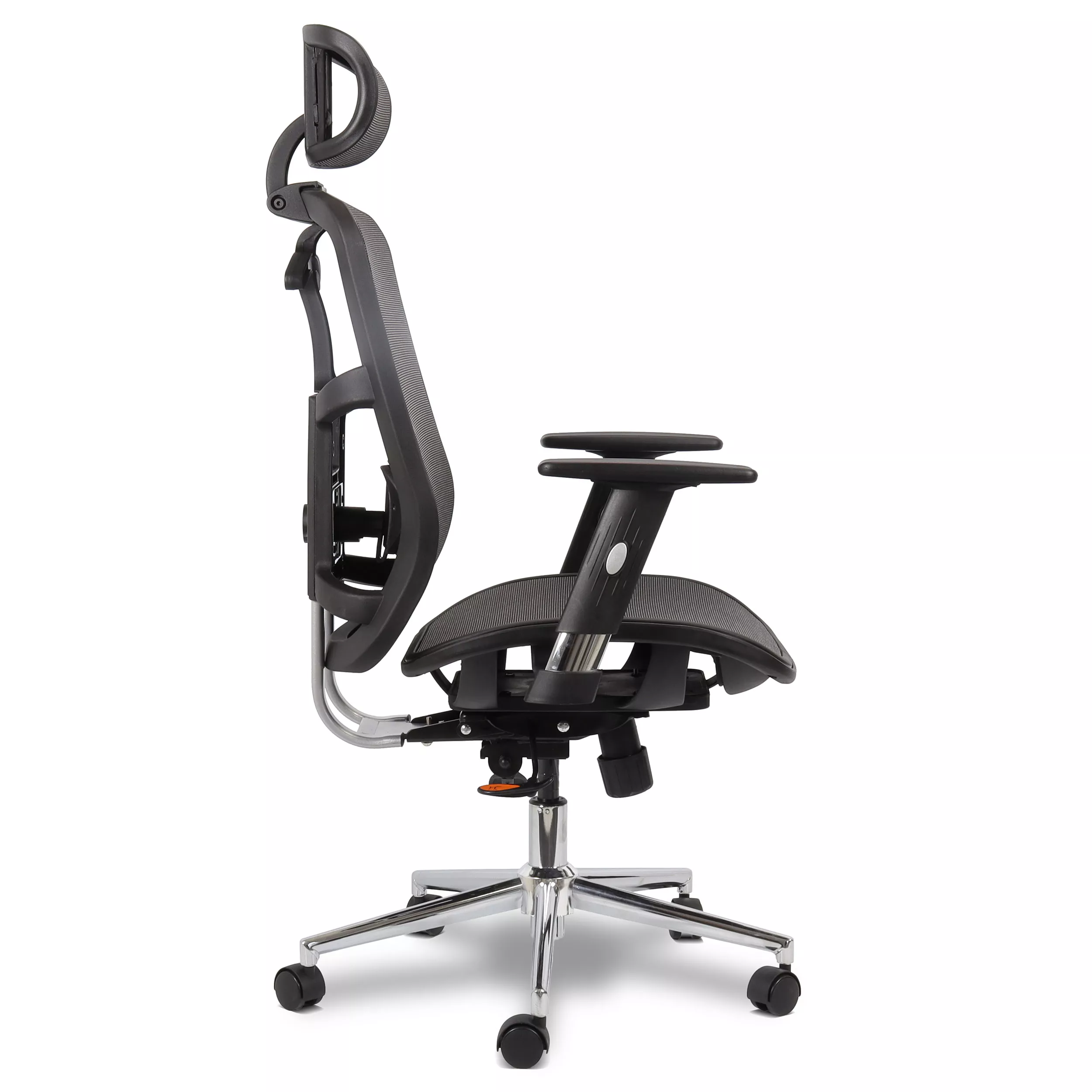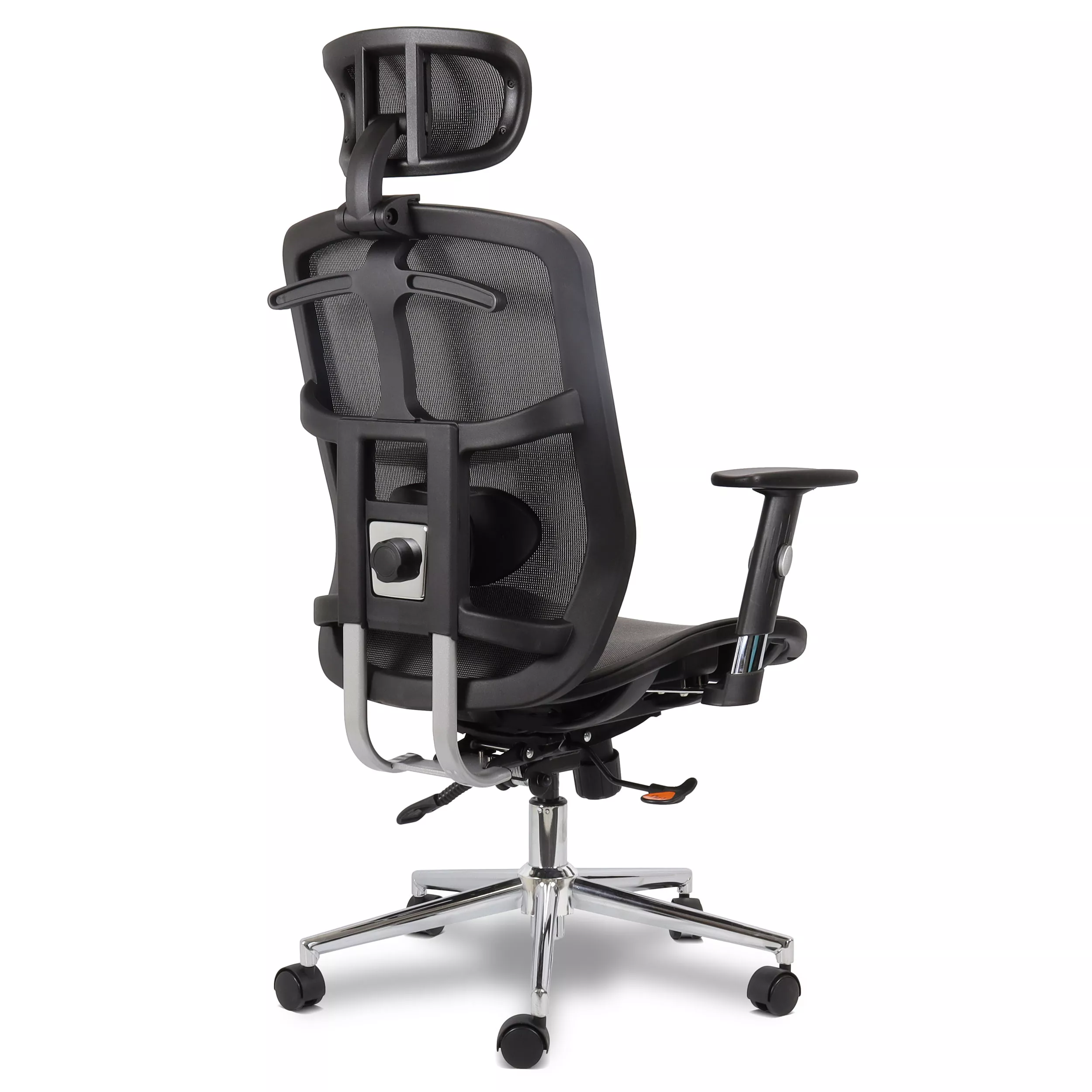 Essa cadeira de escritório possui encosto com corretor de postura lombar de profundidade e altura ajustáveis.