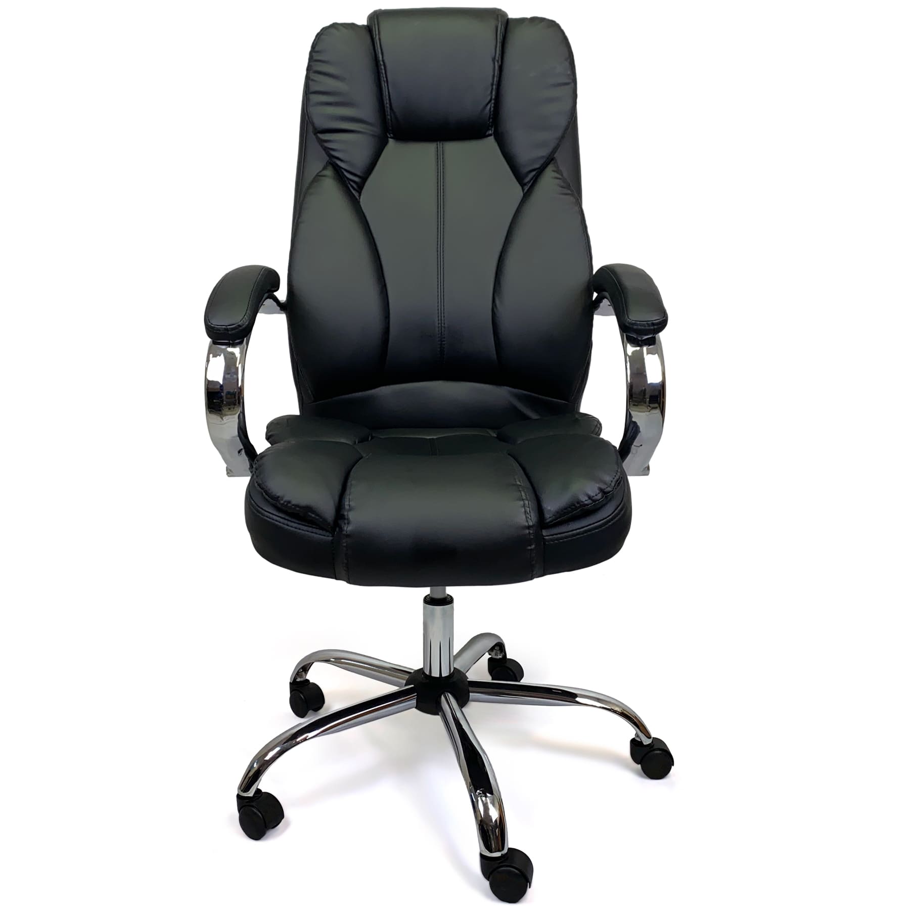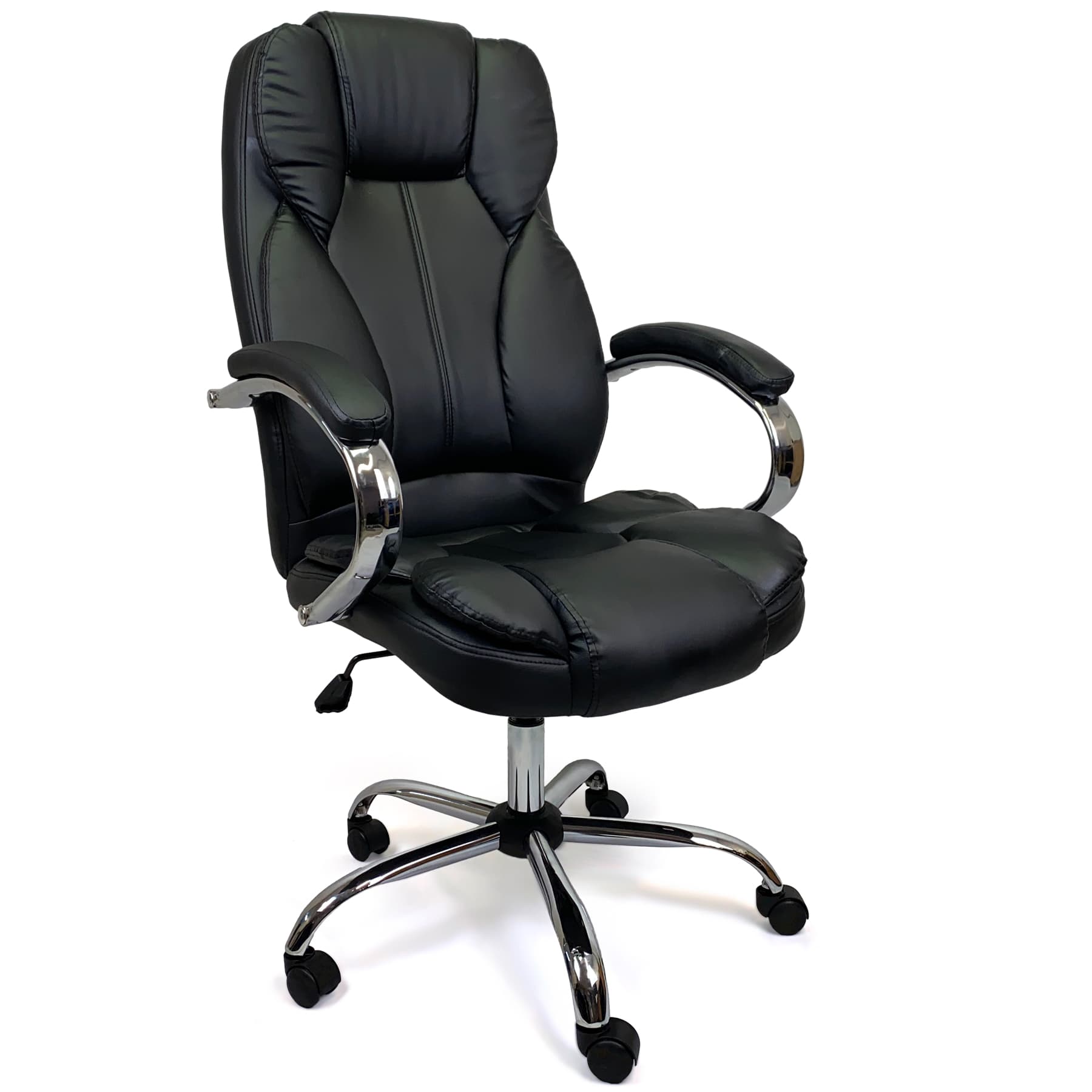 A Lusty apresenta um design clássico e elegante, com revestimento em couro sintético (PU) na cor preta, conferindo um visual sofisticado e fácil de combinar com diferentes estilos de decoração. Sua base metálica cromada garante durabilidade e estabilidade, enquanto as rodas de nylon de 50 mm proporcionam mobilidade suave e proteção ao piso.