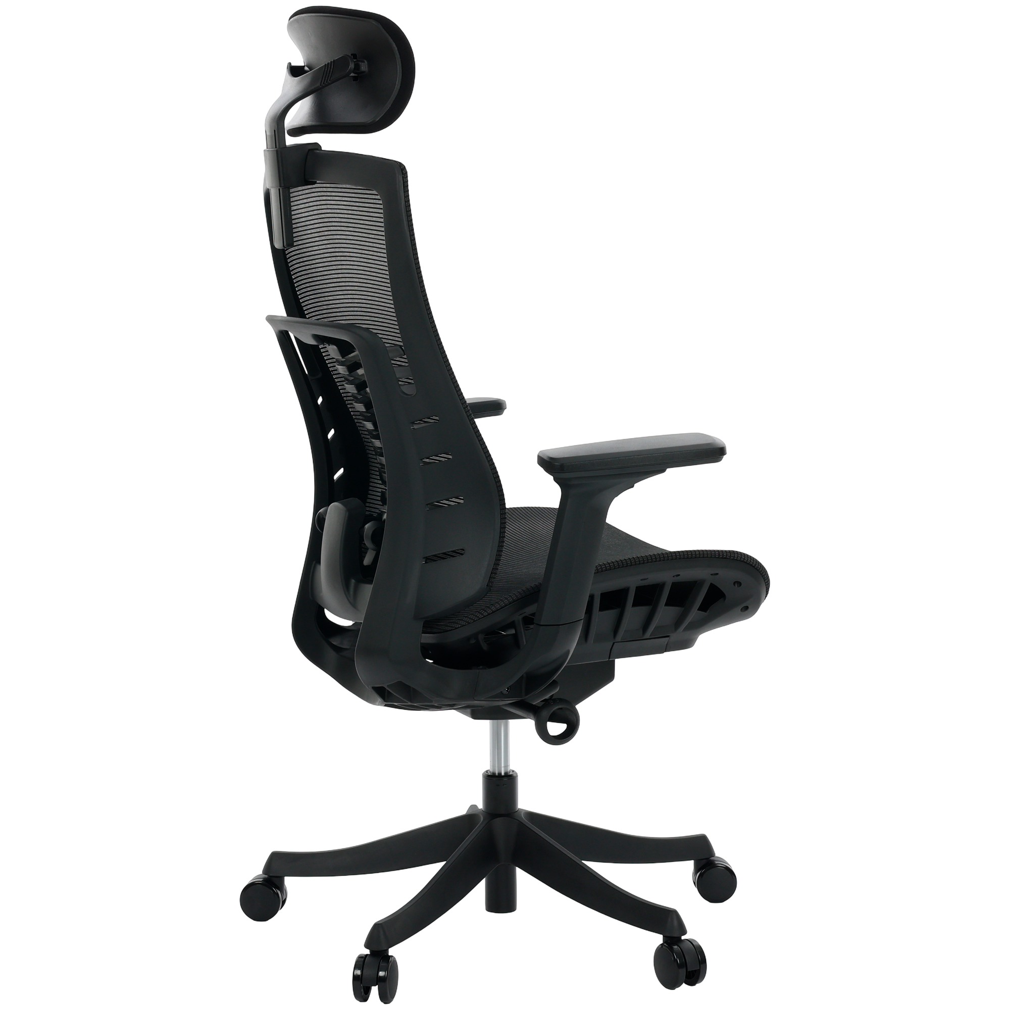 O encosto inteiro com suporte lombar 1D de profundidade ajustável acompanha a curvatura da coluna, promovendo o alinhamento ideal da postura. A estrutura flexível da tela responde aos movimentos do corpo, oferecendo sustentação equilibrada e conforto dinâmico em todas as posições.